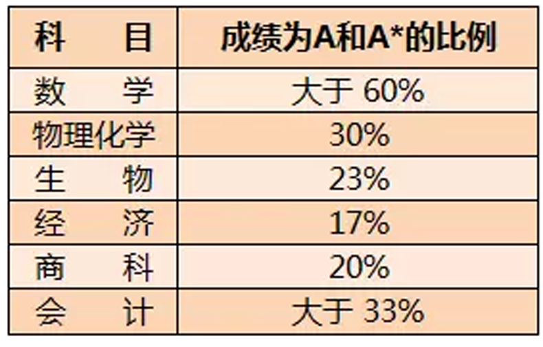 爱德思考试局还发布了中国大陆地区A Level的考试平均成绩统计,依据不同科目,统计考A*和A的学生比例,见下表: